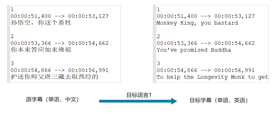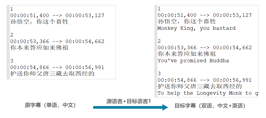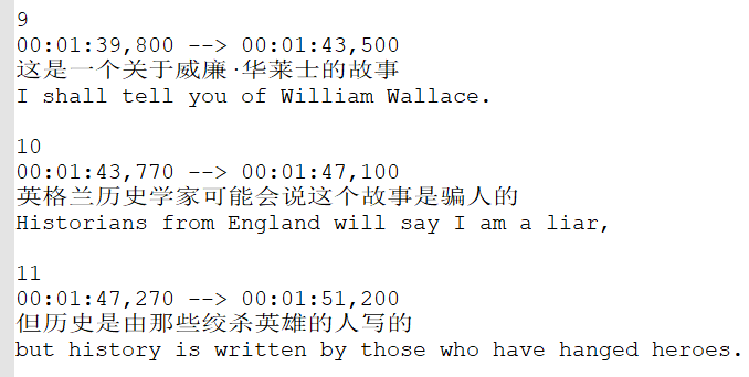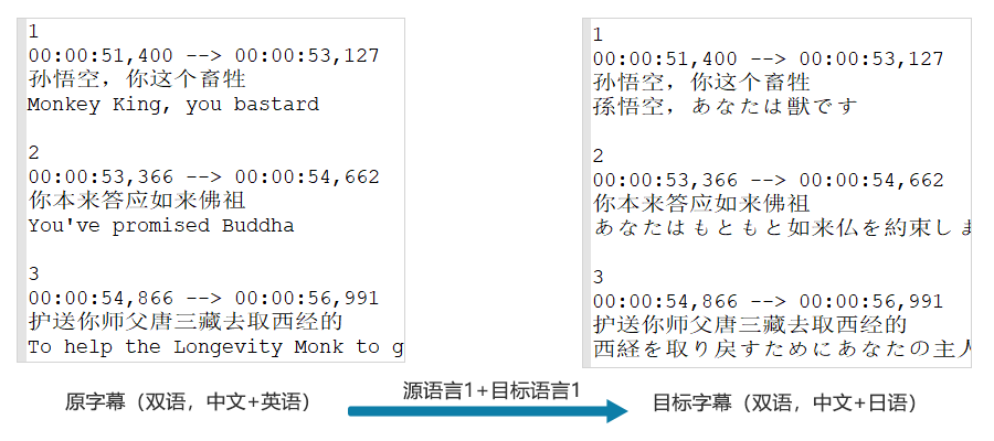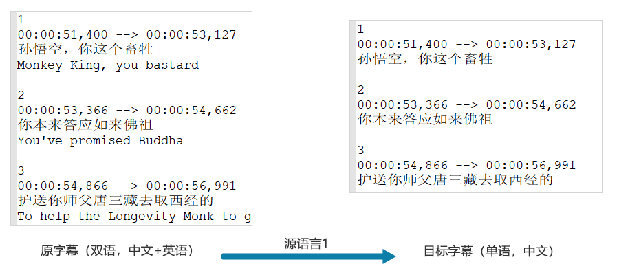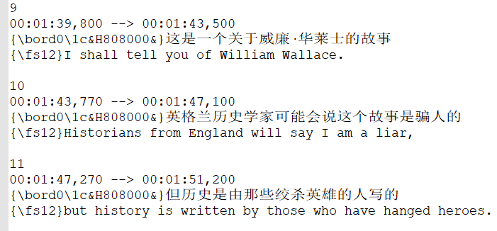 語言屬于雙語,每個時間軸里(下面)只有兩行對白,一行是語言1,一行是語言2;