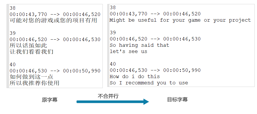 系統允許兩行雙語中存在異常情況,比如個別的時間軸只對應一行對白,這種情況系統會智能妥善處理。